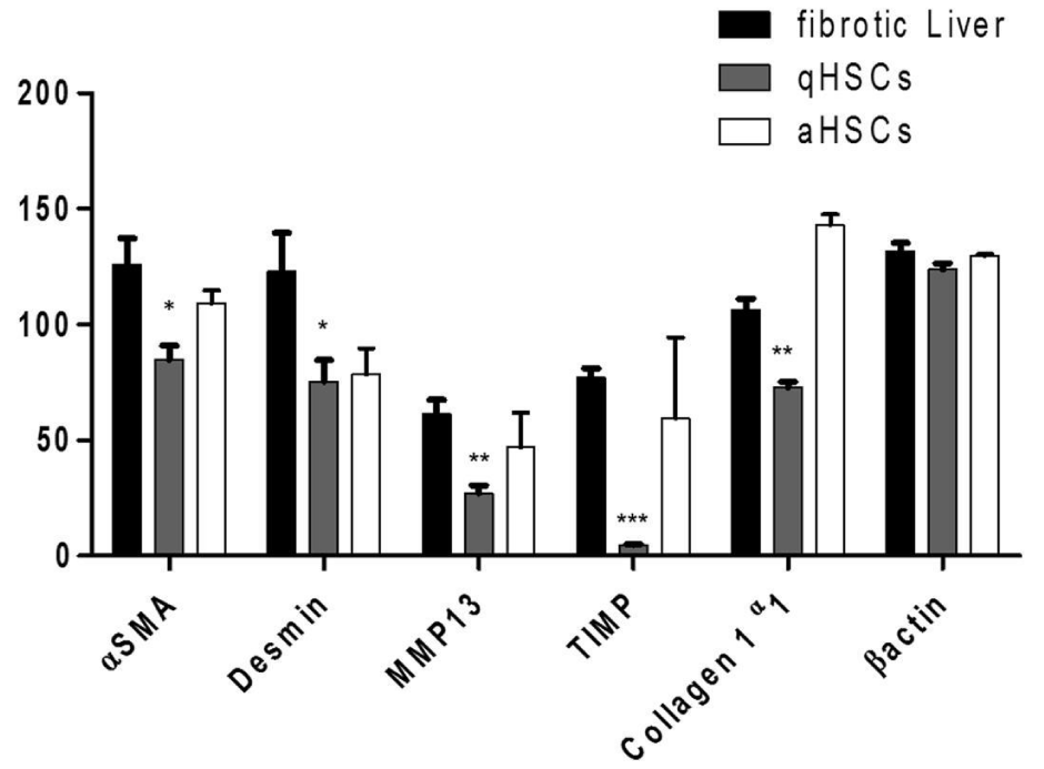 Myofibroblast like phenotype of HSCs is a typical manifestation of liver inflammation. The phenotypic changes identified in the culture conditions were similar to the injured liver as the expression of αSMA is the hallmark of HSCs activation [24]. aHSCs are further characterized by loss of vitamin A storing ability and enhanced collagen and TIMP expression [6,8]. In the first phase of this study, HSCs were isolated from CCl4-injured mouse liver and cultured. HSCs transform from a non-proliferative to a highly proliferative state over a period of eight to ten days and express αSMA and other profibrotic genes [25]. Both qHSCs and aHSCs were characterized by gene expression analysis and our results are in accordance with reports that the expression of aHSCs specific genes: αSMA, TIMP, MMP13 and Collagen IαI was increased in aHSCs compared to qHSCs [26].