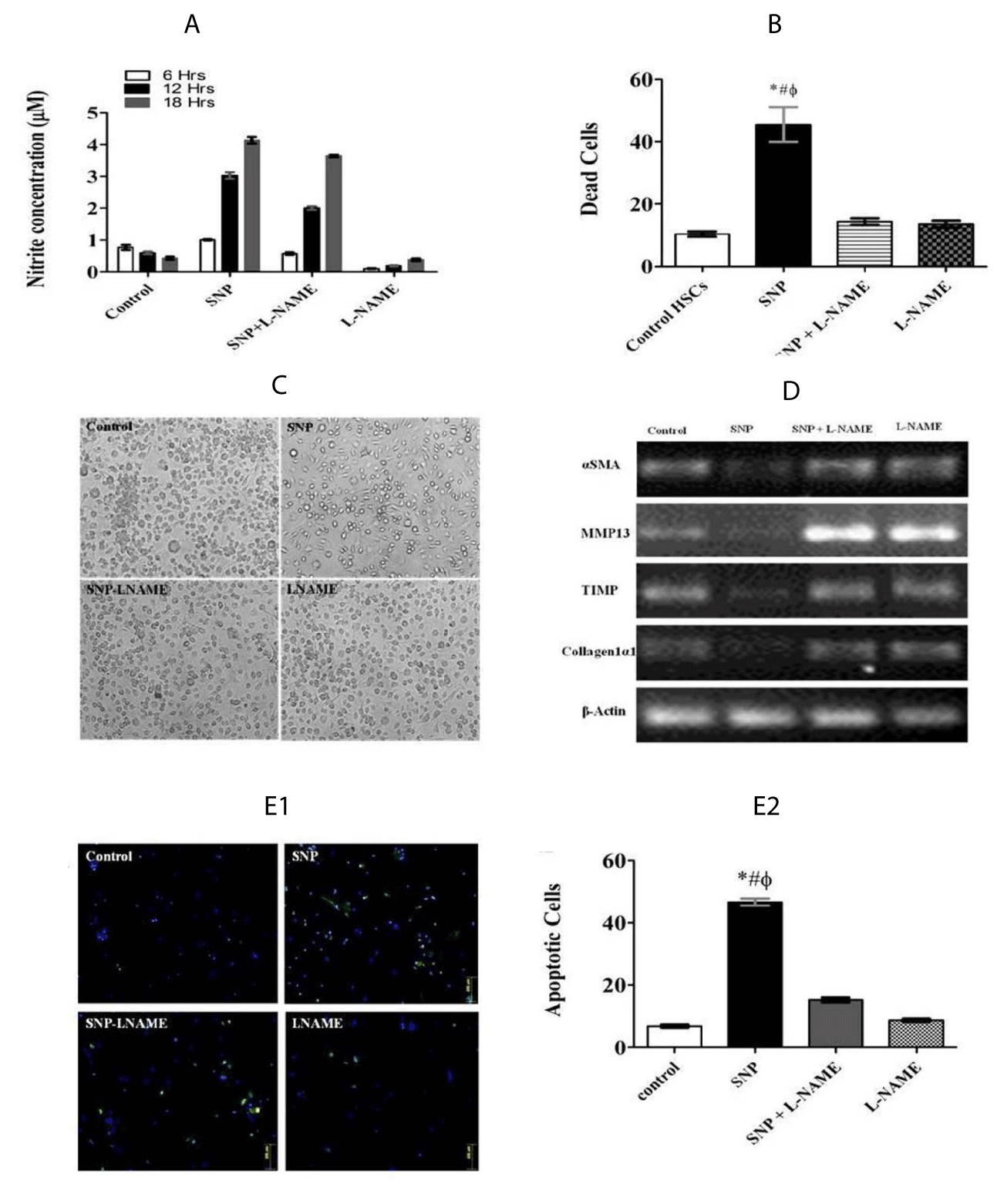 Figure 2: Apoptosis analysis of HSCs by NO. A) Nitrite concentration (μM) in HSCs cultures after 6, 12 and 18 hours. B) Effect of SNP treatment on HSCs viability. C) Morphology of the activated HSCs after treatment with SNP and L-NAME. D) SNP treatment reduced the expression HSCs specific genes. E) Annexin V binding assay for different treatments. DAPI was used to counter stain nuclei. Significantly high number of annexin V positive cells were detected in SNP treated group compared to control and other groups (E1). Quantification of Annexin V positive cells (E2). All values were expressed as mean ± SEM (p* < 0.05 for SNP vs. control, p# < 0.05 for SNP vs. SNP + L-NAME, pɸ < 0.05 for SNP vs. L-NAME).