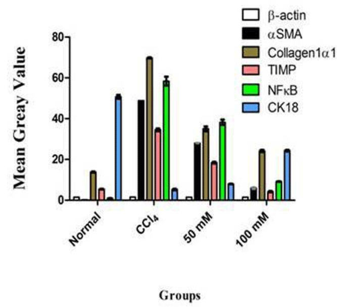 To establish whether NO generated through SNP can induce the apoptosis or inhibition of aHSCs in fibrotic liver to resolve the fibrosis; the gene expression of fibrotic (αSMA, Collagen IαI, TIMP and NFκB) and hepatic (CK18) markers was analyzed. The expression of αSMA, Collagen IαI, TIMP and NFκB genes was increased in CCl4 group (48.815, 69.534, 35.191, 62.624) as compared to vehicle controls while, the expression of CK18 was decreased in CCl4 group (4.87). αSMA, Collagen IαI, TIMP and NFκB mRNA expression was notably lowered in 100 mM SNP group (5.504, 25.269, 2.79, 9.038) as compared to the 50 mM SNP (27.941, 33.056, 7.625, 38.362) and CCl4 groups. In contrast, CK18 expression was increased in 100 mM SNP group (24.794) compared to 50 mM SNP (8.106) and CCl4 groups (Figure 3).