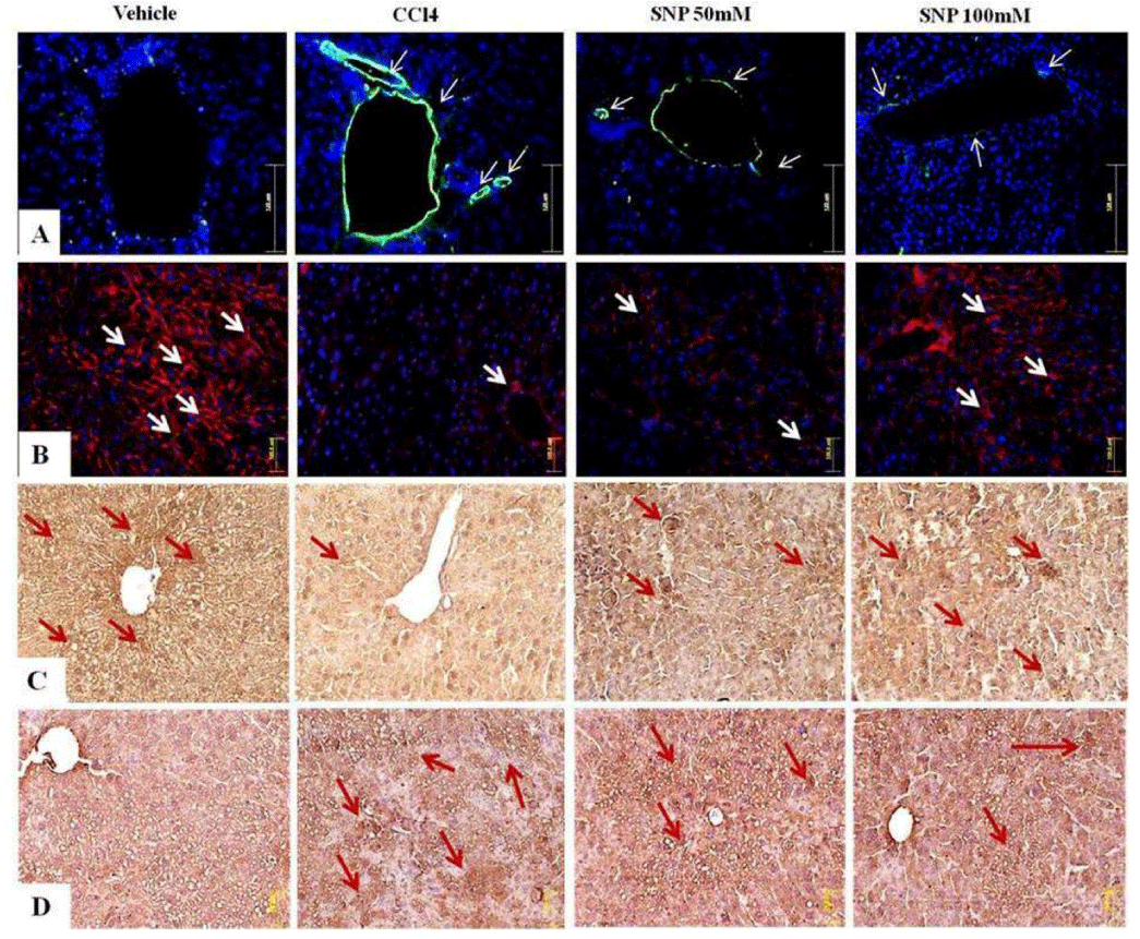 Immunofluorescence analysis of both fibrosis and liver markers further confirmed the inhibitory and apoptotic effects of SNP induced NO. The expression of αSMA was increased in CCl4 group compared to vehicle control and lowered in 100 mM SNP group as compared to other treated groups. This showed that the NO produced by SNP induced the inhibition of aHSCs in fibrotic liver. However, the increased expression of CK18 in 100 mM SNP group showed the normalization of liver structure. In contrast, to the increased expression of iNOS, a clear reduction in the expression of eNOS was shown in CCl4 group. The expression of iNOS was increased in 100 mM SNP group. However, down regulation of eNOS induced by CCl4 induced was overcome in the SNP treated groups (Figure 4).