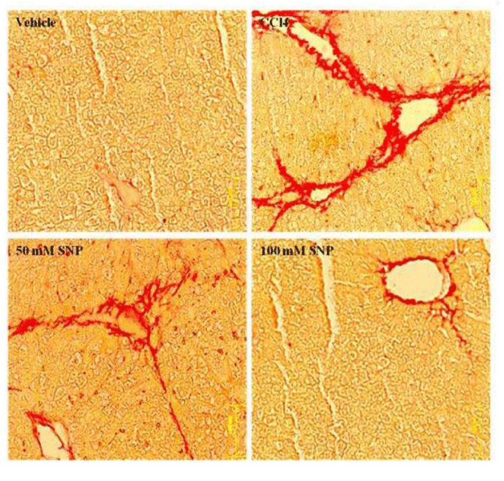 After CCl4 induced liver fibrosis, mice in two separate groups were treated with 50 mM and 100 mM SNP twice a week for 4 weeks. After 24 hours of last SNP injection, mice were sacrificed and fibrosis was analysed by gene expression analysis, immunostaining of αSMA, CK18, iNOS and eNOS, Sirius red staining and liver function tests.