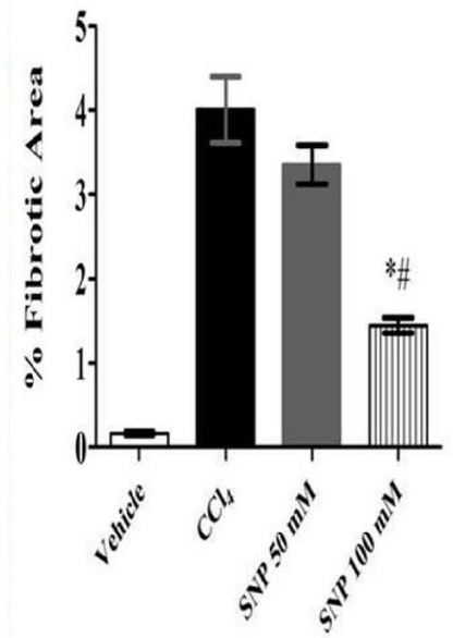 Figure 5: Estimation of collagen levels in different treatment groups. A) Staining with Sirius red demonstrated that collagen levels were greater after CCl4 injury and were reduced by treatment with 100 mM SNP. B) Graphical representation of %fibrotic area estimated by image J software. All values were expressed as mean ± SEM. (p* < 0.05 for 100 mM SNP vs CCl4 control and p# < 0.05 for 100 mM SNP vs 50 mM SNP).