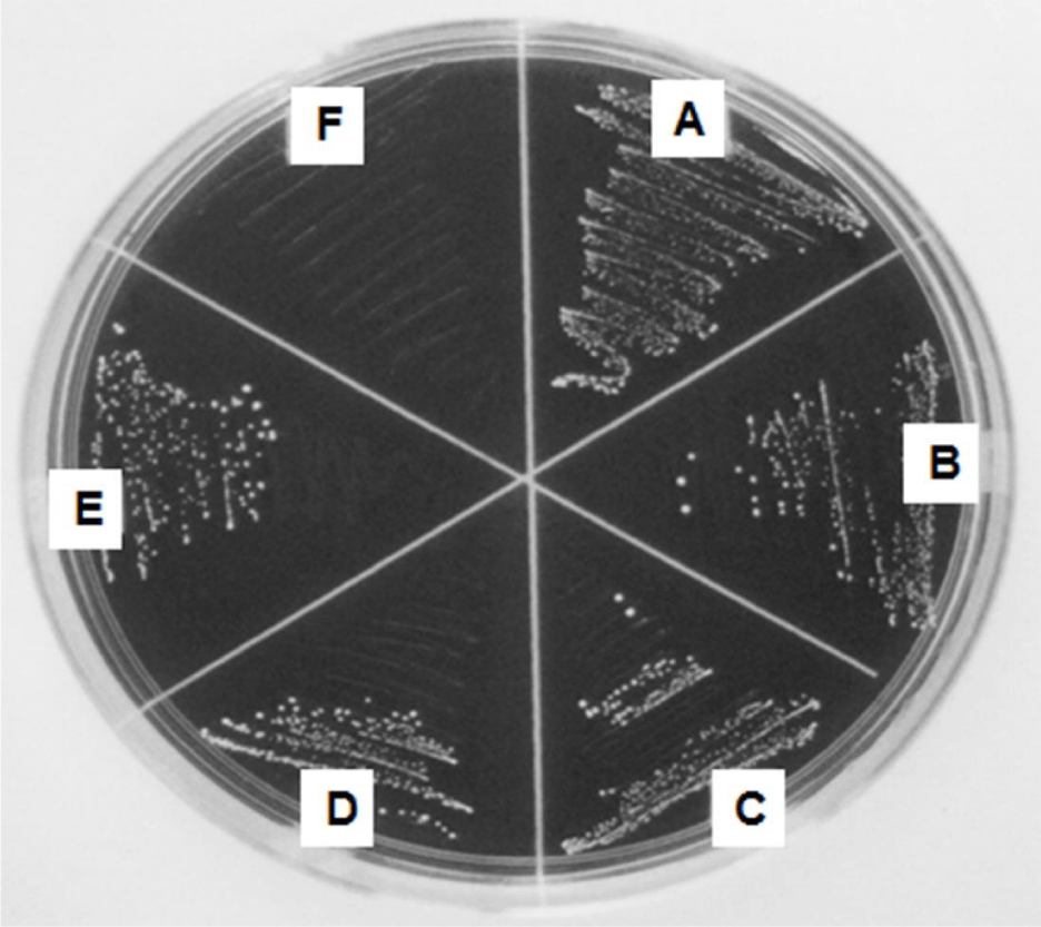 Figure 1: Antibacterial effects of essential oils for 1 m of exposure. Streptococcus mutans were exposed to 4 kinds of essential oils containing thymol, eugenol, geraniol and clove oil at 100 μg/ mL for 1 m. Blank group (A), and the antibacterial effects of essential oils such as geraniol (B), eugenol (C), clove oil (D) and thymol (E) were compared with triclosan (F) used as a positive control.