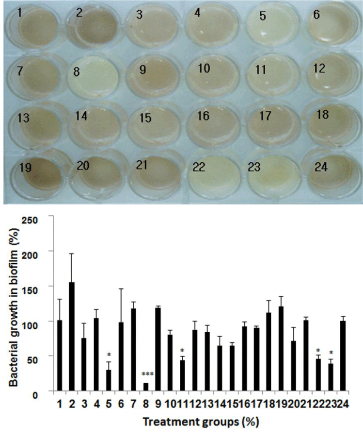 Nonpolar poloxamer biofilm was prepared with 30% Di-block copolymer (poloxamer F127) composed of polyoxyethylene and polyoxypropylene. After 1mL of overnight culture broth of Streptococcus mutans was mixed with the biofilm containing 1% sucrose and 0.4% 2, 3, 5-Triphenyltetrazolium Chloride (TTC), it was transferred into 24-well plate by 1mL/well and incubated for 3 h at 4℃ for solidification. The biofilm was exposed to 100 μL of the indicated doses of essential oils for 1 m for their penetration into biofilm. After that, the remaining essential oils was removed and the 24-well was incubated for 48 h at 37℃ to observe the bacterial growth visualized by AlphaEase®gel image analysis software (Alpha Innotech, CA, US). The anti-biofilm effect of essential oils was quantified as a percentage compared to the blank group (density of cell growth in essential oils-treated biofilm / density of cell growth in f intact biofilm ×100).