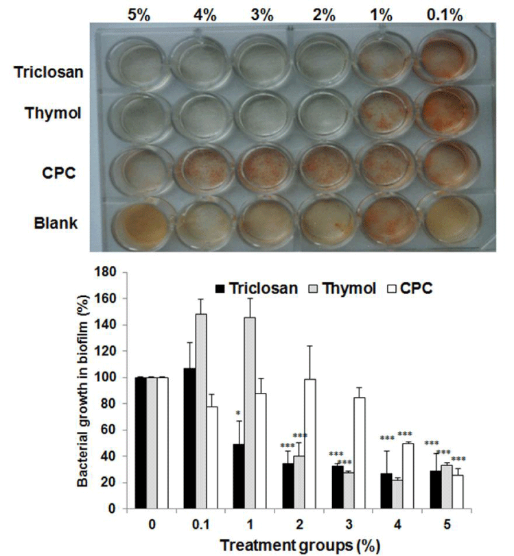 Figure 4: Antibacterial effect of essential oils on Streptococcus mutans in dextran biofilm adhered to glass rod. The antibacterial effects of essential oils on bacteria in dextran biofilm adhered to glass rod were evaluated in this experiment. The biofilm was exposed to the indicated doses of triclosan used as a positive control and thymol for 1 m and transferred into THB medium containing Streptococcus mutans and TTC to observe the bacterial growth. Lower panel represents respective relative protein percentage compared to the blank group (density of cell growth in essential oils-treated biofilm / density of cell growth in f intact biofilm ×100). Data are given as means of values ± S.D. from three independent experiments compared with control (* P < 0.05, ** P < 0.01, *** P < 0.001).
