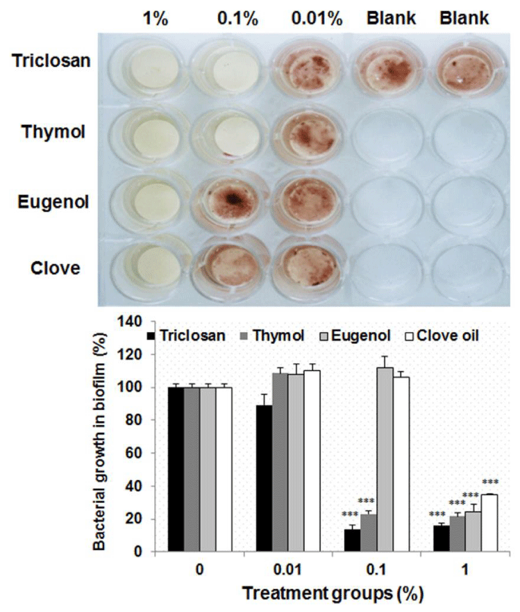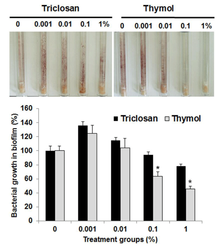 Dextran biofilm adhered to glass rod was prepared using glass rod with 7 Cm in length and 0.5 Cm in diameter. For the growth of Streptococcus mutans in dextran biofilm adhered to glass rod which put in test tube containing 1% sucrose and THB medium, they were incubated for 48 h. Then, after the glass rods were taken out of each test tube, they were exposed to the indicated doses of triclosan and thymol for 1 m and transferred into THB medium containing Streptococcus mutans and TTC to observe the bacterial growth visualized by AlphaEase®gel image analysis software (Alpha Innotech, CA, US). The anti-biofilm effect of essential oils was quantified as a percentage compared to the blank group (density of cell growth in essential oils-treated biofilm / density of cell growth in f intact biofilm ×100).