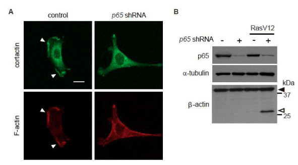 Here, we show that in the absence of p53, knock down of the NF-κB component, p65/ RelA, increases β-Actin cleavage and decreases lamellipodia formation in cells expressing oncogenic Ras. Ectopic expression of a mitochondria-targeting form of p65/ RelA, in turn, reduces cleavage of β-Actin. Our results suggest that NF-κB may promote oncogenic Ras-induced invasion of p53-deficient cells by facilitating the formation of lamellipodia through reduction of β-Actin cleavage.