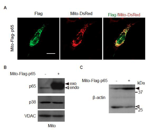 pSuper retro p65 puro was cloned p65 target sequence [6], 5′-GAAGAAGAGTCCTTTCAAT-3′ into a pSuper retro puro (Oligoengine, Seattle, WA). pBabe Ha-RasV12 with a hygromycin selection marker were used [6]. The Mito-DsRed expression vector was obtained from Clontech Laboratories Inc. To generate a pcDNA3-Mito-Flag-p65 vector, the mitochondrial targeting sequence from subunit VIII of human cytochrome c oxidase was fused to the 5′-end of the Flag-tagged p65.