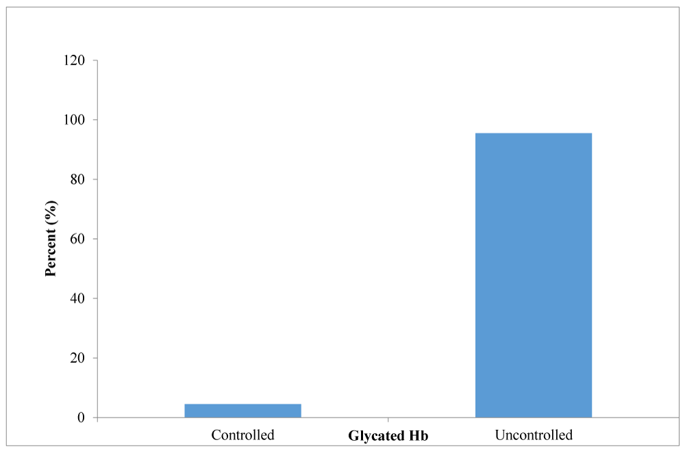 The mean (± standard deviation) fasting blood glucose was 8.57 (± 4.50) mmol/L. Seventy eight (39%) diabetic subjects achieved target fasting blood glucose. The mean 2 hours postprandial glucose of the diabetic subjects was 13.0 ( ± 6.14) mmo/L. Only 38 (19%) achieved target level. The mean (± standard deviation) glycated hemoglobin was 9.94 ± 1.87%. Using the glycated hemoglobin, 192 (96%) of the diabetic subject did not achieve target level (Figure 1).