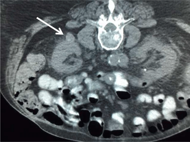Figure 1: Axial CT scan of abdomen in a prone position shows an exophytic solid lesion (arrow; 1.7 cm in diameter, 46 Hounsfield units) arising from the left kidney.