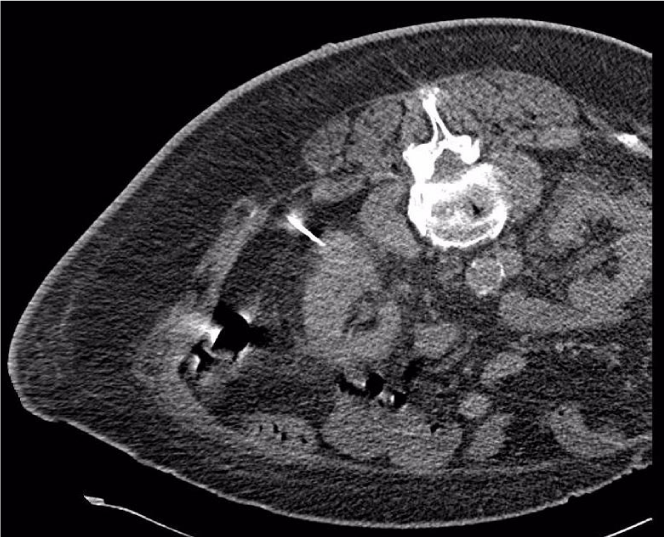 Although it is likely that the subcutaneous carbon dioxide would have been clinically insignificant, we elected to aspirate the gas through a pigtail catheter. If extensive enough, the carbon dioxide could theoretically cause some degree of subcutaneous fat necrosis. Also, increased retroperitoneal pressure from perinephric carbon dioxide could theoretically compress the kidney and impair renal perfusion if severe enough and left untreated for long enough. Metabolic disturbances could also occur, as the carbon dioxide is converted in the blood to carbonic acid leading to respiratory acidosis, though this would require enough carbon dioxide to overcome the body’s natural buffers.