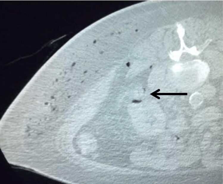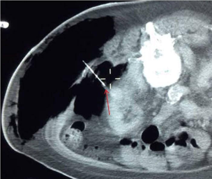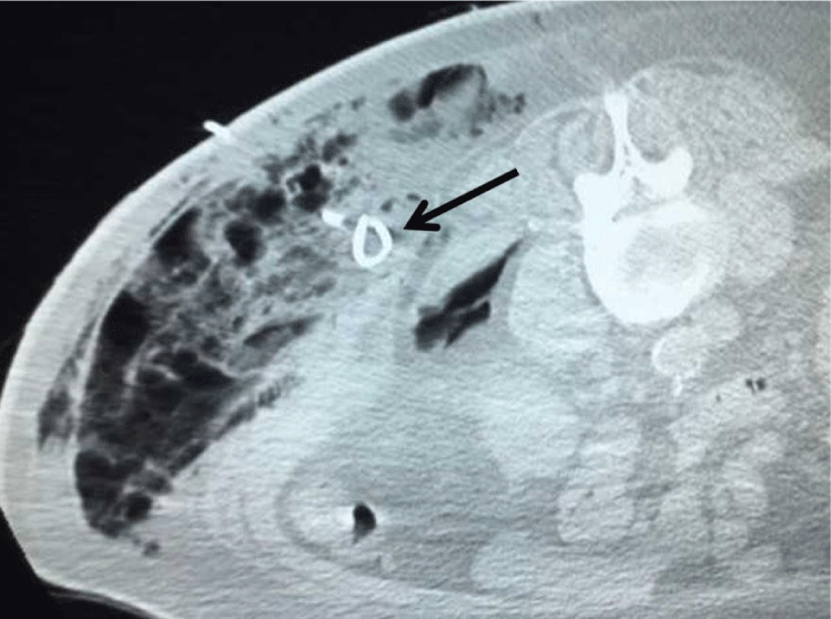 Figure 7: After ablation of the tumor, CT scan of the abdomen shows shrinkage of the tumor with typical post-ablation intra- and peri-tumoral gaseous density (arrow). Note the significant interval resolution of the subcutaneous and retroperitoneal gas.