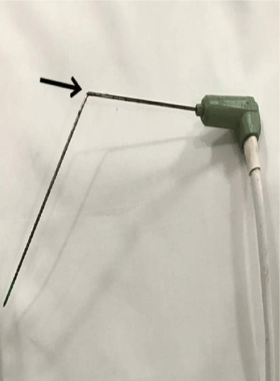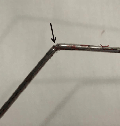 The microwave ablation probe was inspected and a break in the probe was noted (Figure 5). The probe was saved and sent to the manufacturer after reporting to the patient safety department at VA.
