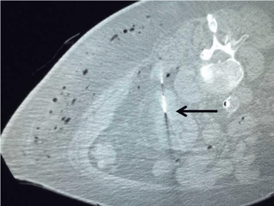 Figure 6: After evacuation of gas, a 17-gauge microwave ablation probe placed in the left renal tumor (arrow).