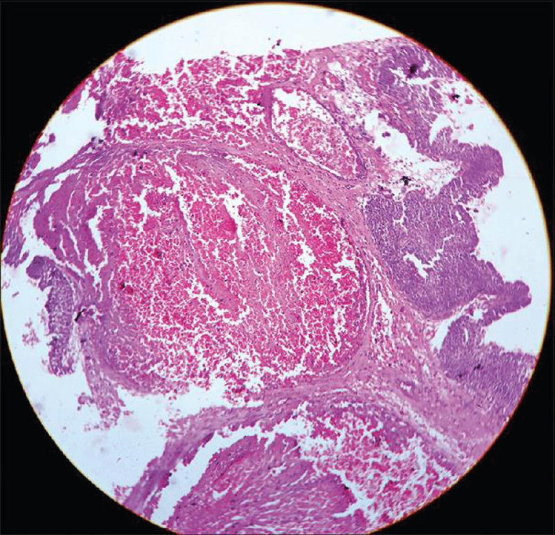 A 60 year old female presented to the gynecology department of our hospital with a mass protruding from the introitus and intermittent urethral bleeding since past 3 months. She was examined and referred to the urology department for further management. Physical examination revealed an erythematous, polypodial mass surrounding the urethral meatus (Figure 1). The lesion was 3 cm in diameter and firm in consistency and was not friable. Rest of the clinical examination did not reveal any significant findings. Hematological investigations revealed a mild anemia with hemoglobin level of 9.7 gm% .Iron studies and cogulation studies were within normal limits. Ultrasound sonography abdomen and pelvis showed no significant pathology. Urethrocystoscopy was done which showed that the tumor was prolonged until the distal third of the urethra and easily bleeding. The cystoscopy was able to cross the tumor and to explore the posterior urethra, bladder neck and bladder which appeared normal. As it was a distal solitary lesion, decision was made to do a wide excision of the lesion. After the excision, the urethral mucosa was everted and sutured over an indwelling Foleys catheter. The catheter was removed after 2 days. Histopathology showed tissue bits lined by transitional epithelium underneath showed a tumor. Tumor composed of variably sized blood-filled vascular spaces lined by flattened endothelial cells separated by thin fibrous septae. Active thrombosis was not seen in the vessels. The final histopathological diagnosis was given cavernous hemangioma of the urethra (Figure 2). The postoperative course was uneventful and till this date there have been no recurrence.