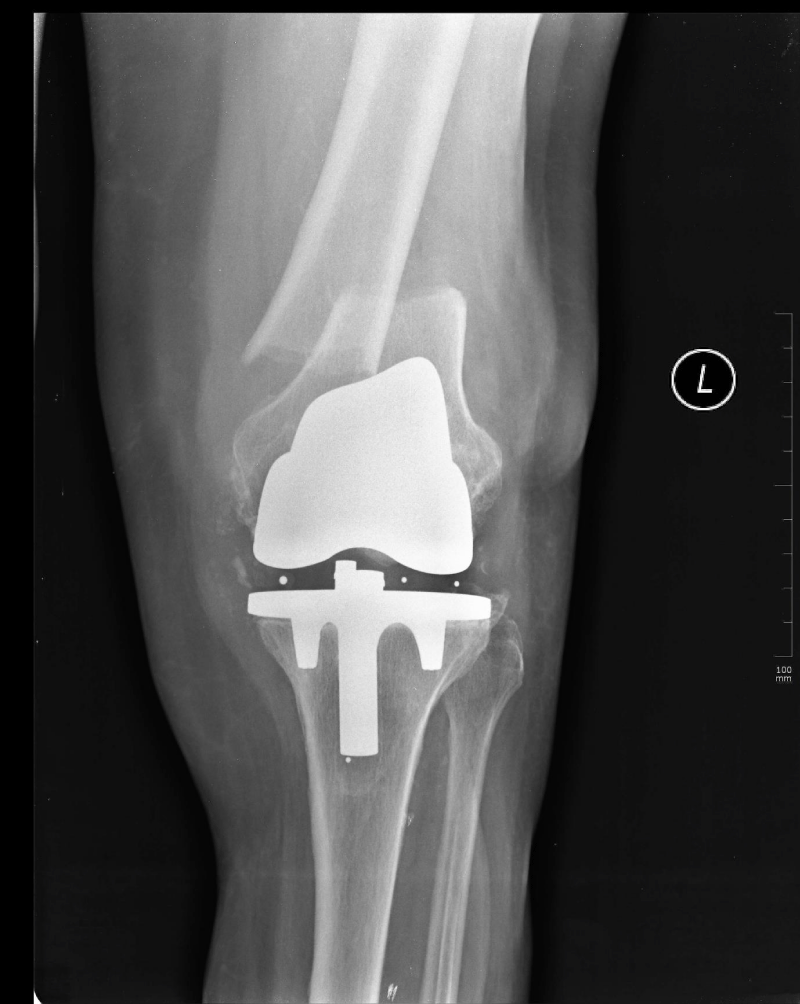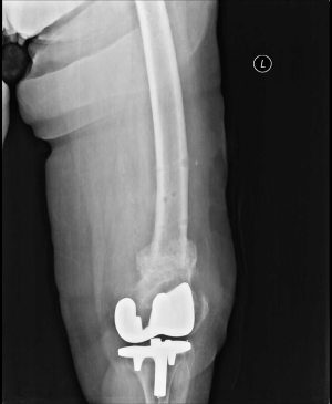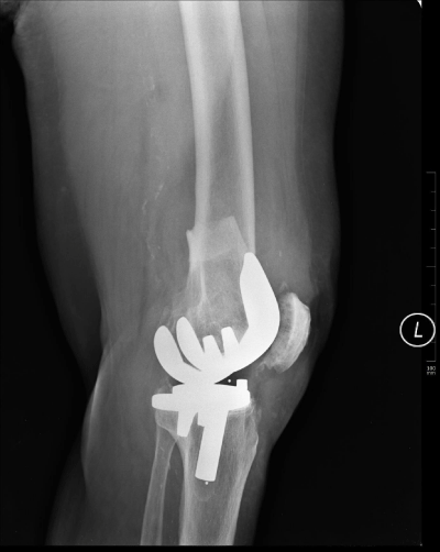 An 82-year-old woman underwent cemented TKR for gonarthrosis. The prosthesis used was the Rotaglide Total Knee System (RTK) ® (Corin Medical Ltd., UK). She fell in her home, 6 years after her procedure, sustaining a periprosthetic fracture.