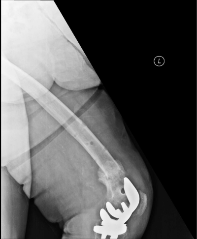 Figure 2: X-rays of the patient demonstrating a Rorabeck type 2 supracondylar displaced periprosthetic fracture