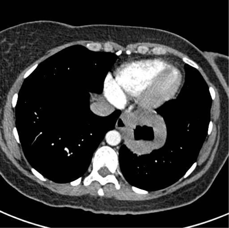 She initially had a Chest X-Ray, which showed a 5 cm, round and well-defined shadow behind the heart suspected to be of HH. This was followed by an enhanced Computed Tomography (CT) Thorax (Figure 1) that showed the CXR abnormality corresponded to a possible 6 cm sequestered lung segment. After discussion in the respiratory Multidisciplinary Team (MDT) meeting she was investigated further with a bronchoscopy. However, the bronchoscopy was normal and bronchial washings did not show any malignant cells. A positron emission tomography computed tomography (PET/CT) was then performed and showed a 6.5 cm thick-walled air filled mass in the lower lobe of the left lung with intense peripheral Fluoro Deoxy Glucose (FDG) uptake suspicious of a malignancy. A barium swallow showed the lesion seen on CT to be continuous with the lumen of the oesophagus (Figure 2). Following this, a large HH at 25 cm was visualised on an Oesophago Gastroduo Denoscopy (OGD) examination.
