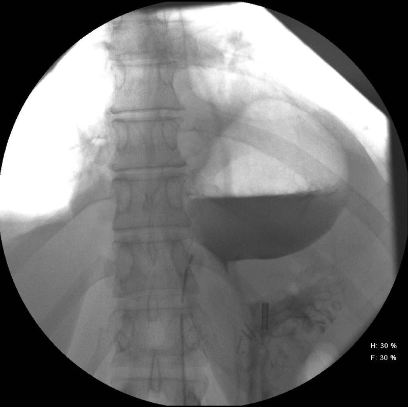 She initially had a Chest X-Ray, which showed a 5 cm, round and well-defined shadow behind the heart suspected to be of HH. This was followed by an enhanced Computed Tomography (CT) Thorax (Figure 1) that showed the CXR abnormality corresponded to a possible 6 cm sequestered lung segment. After discussion in the respiratory Multidisciplinary Team (MDT) meeting she was investigated further with a bronchoscopy. However, the bronchoscopy was normal and bronchial washings did not show any malignant cells. A positron emission tomography computed tomography (PET/CT) was then performed and showed a 6.5 cm thick-walled air filled mass in the lower lobe of the left lung with intense peripheral Fluoro Deoxy Glucose (FDG) uptake suspicious of a malignancy. A barium swallow showed the lesion seen on CT to be continuous with the lumen of the oesophagus (Figure 2). Following this, a large HH at 25 cm was visualised on an Oesophago Gastroduo Denoscopy (OGD) examination.