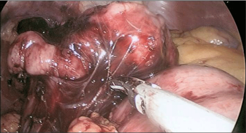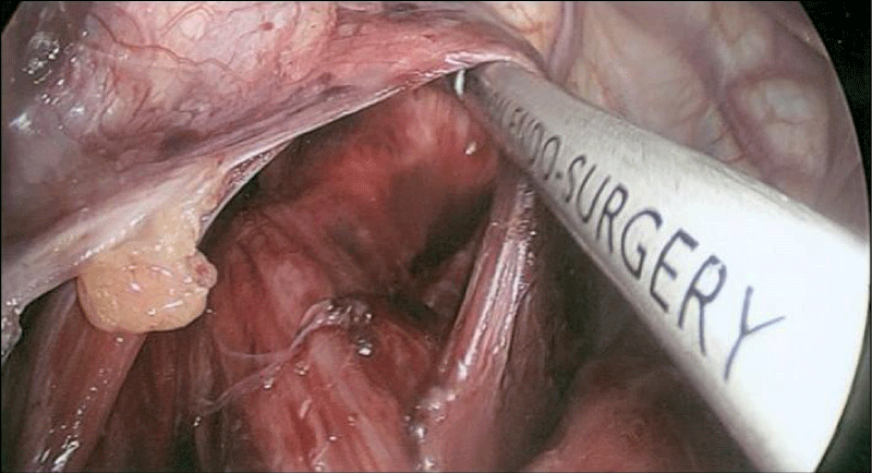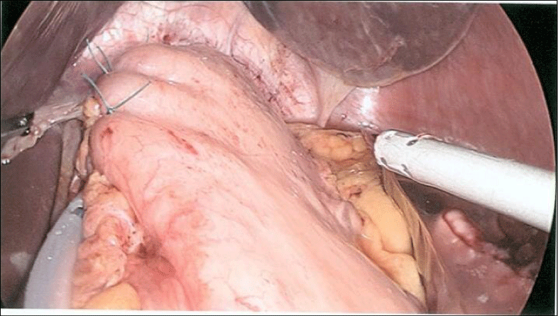 An intraoperative OGD was performed (Figure 3) and showed a small para oesophageal hernia with normal mucosa of oesophagus, stomach and duodenum. During laparoscopy, the hernia was reduced and a para oesophageal extraluminal 4cm multilobulated tumour was visualised in the left posterior mediastinum (Figure 4). After mobilisation of the greater curvature of stomach and lower 1/3 of oesophagus, the tumour was delivered into the abdominal cavity (Figure 5). The tumour was enucleated from the muscular wall without breaching the mucosa and an air leak test did not show any leak. After removing the tumour, a diverticulum of oesophageal mucosa remained (traction diverticulum caused by the tumour) just above the Gastro-Oesophageal Junction (GOJ). It was decided to leave it to regress with time. The diaphragmatic crura were closed with a mattress suture and an anterior Dor fundoplication was performed (Figure 6). The tumour was retrieved using Espiner bag (Espiner medical LTD).