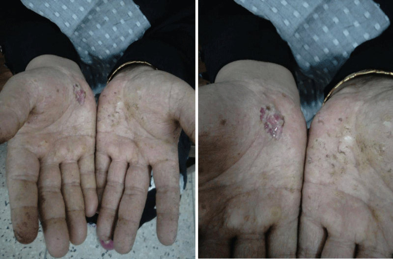 Chronic arsenical intoxication can still be found in our settings. Symptoms of chronic arsenic intoxication include general pigmentation or focal “raindrop” pigmentation of the skin and the appearance of hyperkeratosis of the palms of the hands and soles of the feet. In addition to arsenic-related skin diseases including keratosis, Bowen’s disease, basal-cell-carcinoma, and squamous-cell carcinoma, there is also an increased risk of some internal malignancies. Arsenic-related diseases are common in areas of the world including Bangladesh where the drinking water has a high arsenic content. Here we present a case of 45-year-old female patient who had arsenic-related keratosis, and Bowen’s disease on her right palm. She is from Feni and was exposed to arsenic in drinking water. The patient is still receiving regular follow-up care.