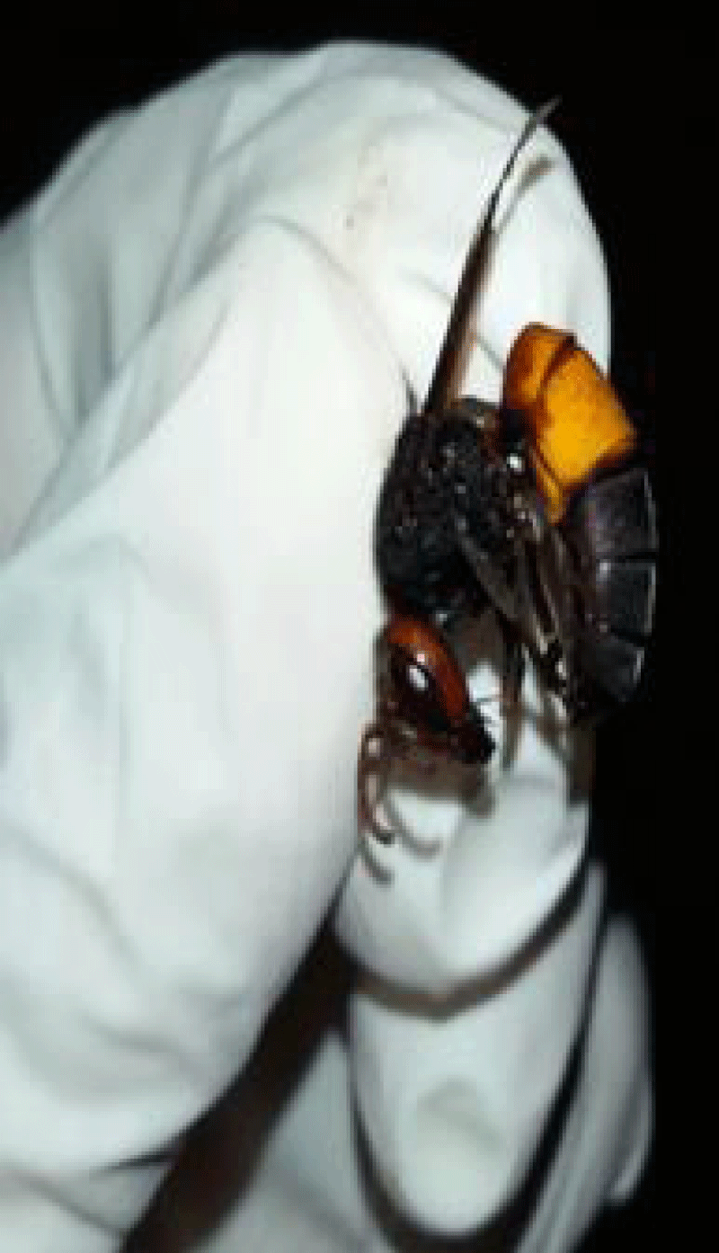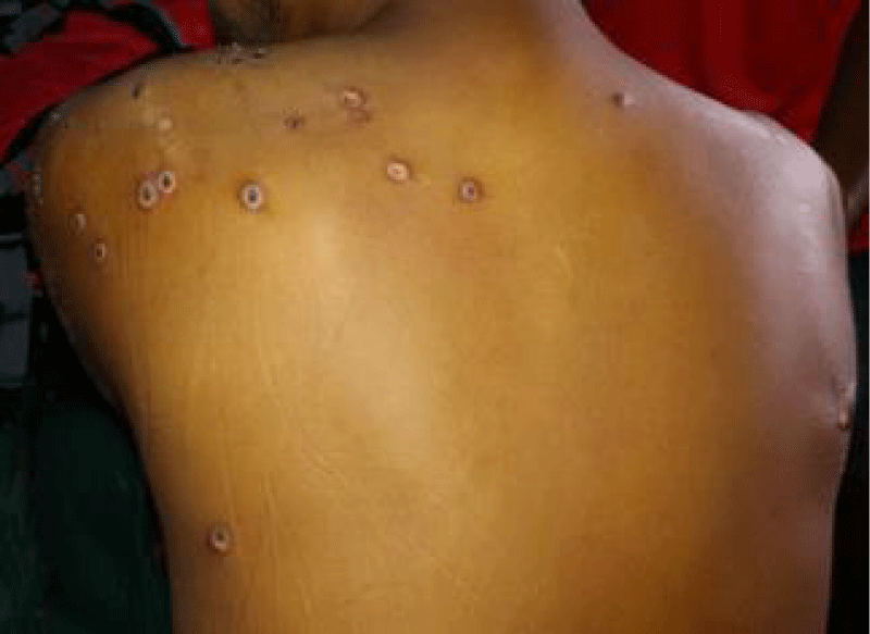 A 13 years old was playing nearby his house in a rural area of Chittagong, Bangladesh. After throwing a stone in a tree he was attached by multiple wasps (Figure 1) and bitten by them. He had excruciating pain over the bitten areas of his back. He was given some local medicine with which his symptoms were not resolved. After 8 hours of bite he noticed that there was no urination since the occurrence. He was take to the nearby health complex where the medical officer referred him to the tertiary level hospital. In the tertiary center he was investigated and found anuric for 14 hours with anorexic and ill. His back was filled with multiple bitten marks (Figure 2). His Hb, cell count was normal, serum potassium was raised to 5.9mmol/l, serum creatinine was found 5.4 mg/dl at day one of admission. He was given IV frusemide with normal saline. In the day second his serum creatinine and potassium raised to 6.1mmoml/l and 7.1mg/dl respectively. He had very small amount of micuration about 100ml/24 hours. Planning of dialysis was taken and after three consecutive day hemodialysis his urine flow became normal and potassium and creating reduced to near normal level. After 6th day he was discharged in a good health.