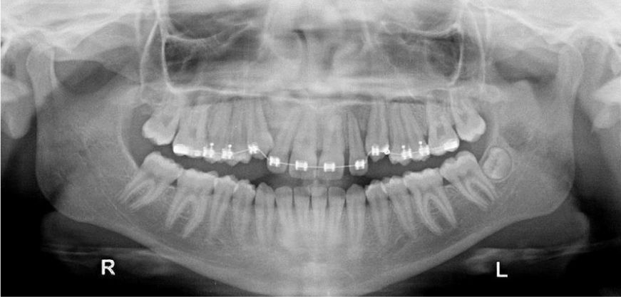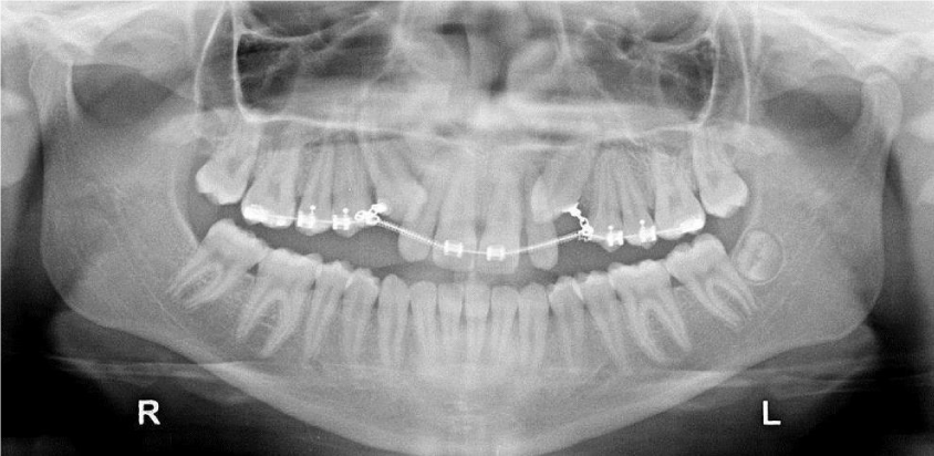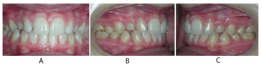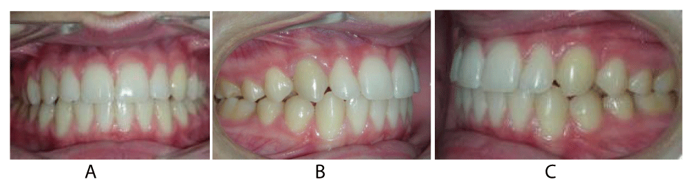 During the treatment two end oral radiographs were made on each side to ensure that the movement of canine was not damaging the roots of the neighboring teeth. When the crowns were erupted a metallic canine bracket was bonded, and the remaining movements were made with sectional, later repositioning the bracket twice. A Flexiloy tm 0.021 X 0.025 was the finishing arch and an Essix retainer was used for retention. The active treatment lasted 2 years long. Both the canines at the end of treatment had good periodontal conditions (Figure 2d, 3a-c).