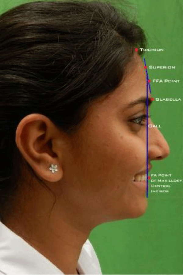 Right lateral profile photographs were taken for 5 patients with a digital camera under standard conditions by the same operator using a Canon EOS 600DSLR Camera having,18 Megapixels, image sensor 22.3X14.9mm,APS-C,CMOS type with maximum output resolution of 5184X3456, macro lens 18-55mm with image stabilizer, 0.25 meters oblique 8 feet, light sensitivity of 6400 ISO. The camera was mounted to a frame set at a fixed distance of 36 inches between the lens and the subject. The patient was then asked to bodily turn to their left and asked to sit on a stool looking at vertical mirror and thus having a right profile side facing the clinician. The head should be in Natural Head Position, with their eyes fixed horizontally. Natural Head Position recorded with the help of fluid level device.92 Light or Bright background, free of shadows and distractions was used. Before taking the smiling image, the photographer instructed the patient to “smile”. Social or forced smile of the patient was captured due to its reproducibility in the natural head position.
