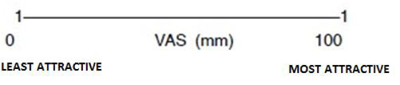 A total of 20 judges (i.e. 10 Orthodontists, 10 Laypersons) received the profile photographs while seated and were asked to mark his or her assessments of the facial attractiveness of the subject on the 100 mm visual analogue scales, which were anchored by the descriptors “Least Attractive” (0) and “Most Attractive” (100). Visual analogue scales have been found to provide rapid, convenient, valid, reproducible, and representative ratings of dental and facial appearance. Each judge was asked to view each photograph for 30 seconds. The judges were given specific instructions on the use of the scale but no images with which to practice. No specific information was given regarding the faces they were to see. Each judge was asked to rate the attractiveness of the photographs on whatever criteria he or she deemed important and enter the ratings in evaluation sheet.