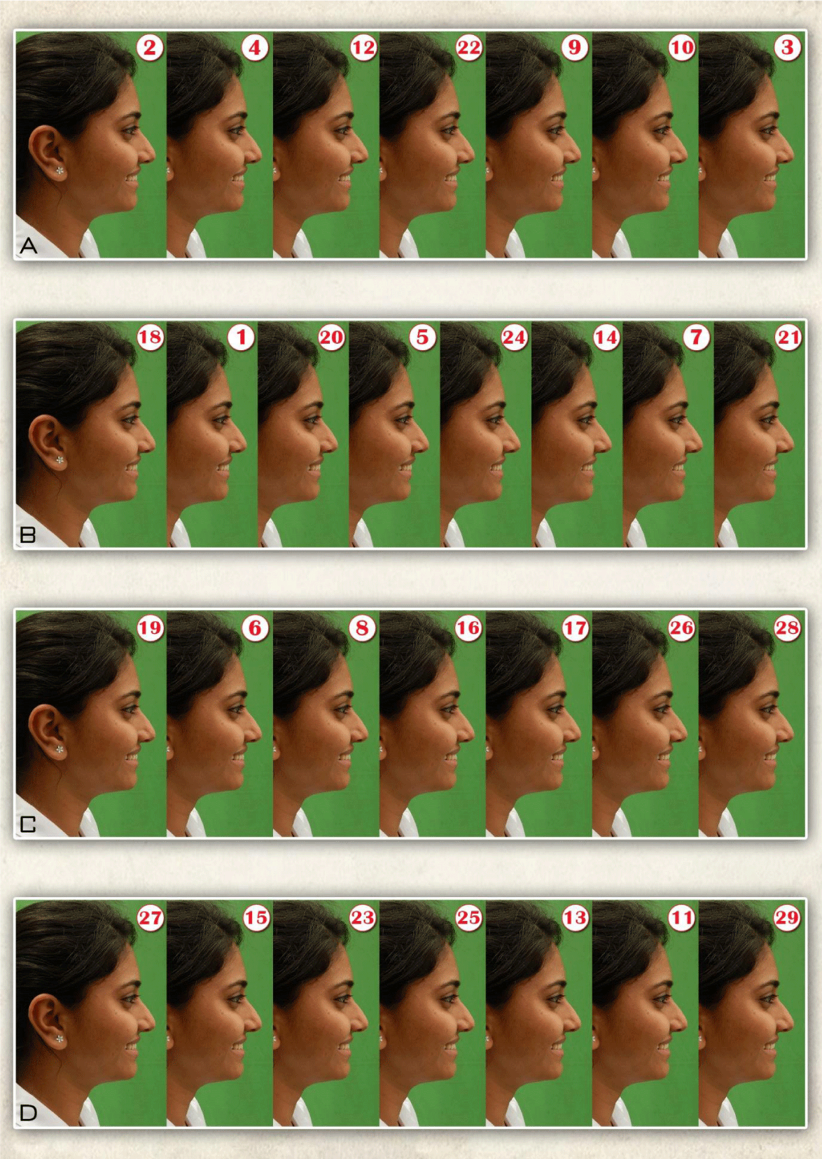 The subject’s repeatable smiling profile photographs were altered with the Photoshop CS6 digital imaging program to obtain four series comprising 29 smiling profile photographs.