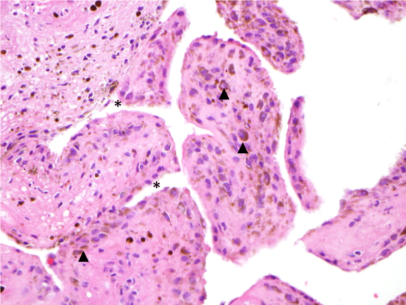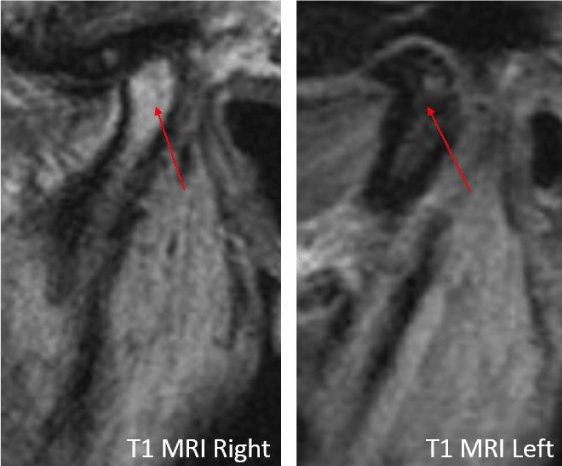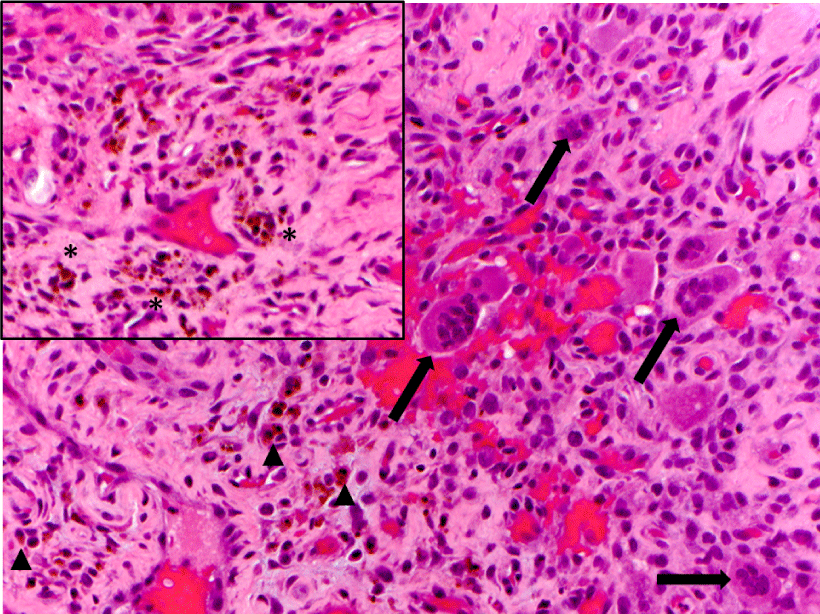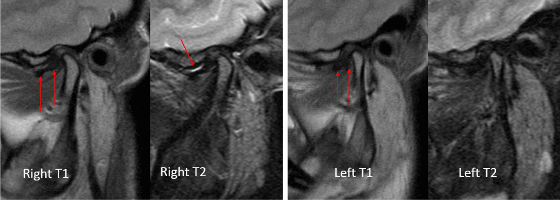 A 24-year-old female presented with a two-month history of right TMJ pain and locking. Examination revealed a 33mm mouth-opening with deviation to the right, bilateral mandibular condyles and right masseter tenderness to palpation, intact cranial nerves and no joint loading. There was no facial or preauricular swelling. The CT scan showed left greater than right condylar flattening with intact cortical outline and no osteolysis (Figure 1). The MRI showed bilaterally displaced discs with the left being deformed (Figure 2). The patient then underwent bilateral arthroscopy. Diagnostic arthroscopy on the left revealed synovial growth with striking reddish-orange discoloration. The disc was seemingly spared from the disease process (Figure 3,4). Synovectomy and debridement were completed. Histologic examination revealed PVNS (Figure 5). On her 10-month follow-up she reported significant improvement in pain and functional-limitation scores. She had a painless, symmetric 35mm mouth-opening with no joint tenderness or loading.