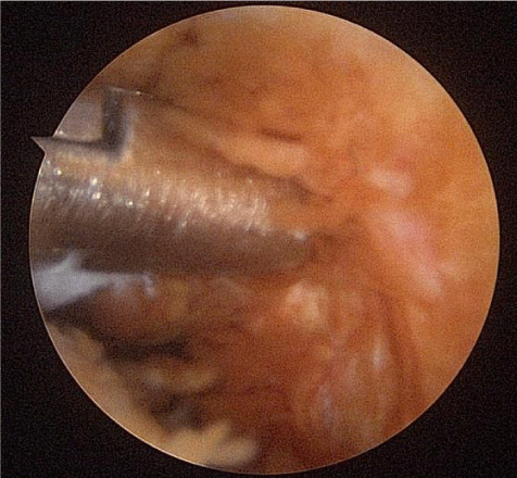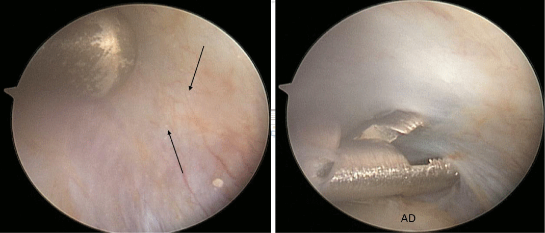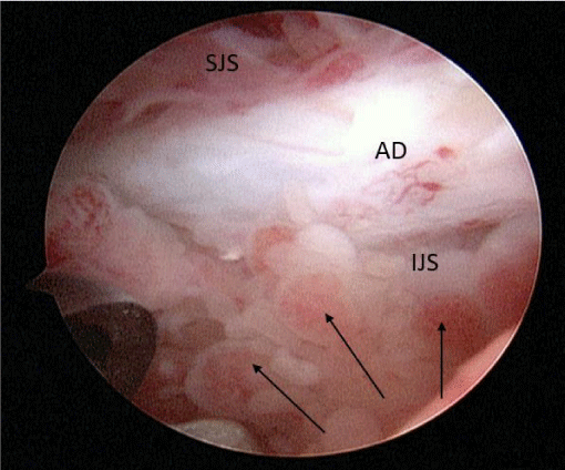 Three patients underwent double puncture arthroscopy after completing an unsuccessful course of conservative therapy (NSAIDs, mouth guard, and diet modification). The areas of significant pathology during the diagnostic arthroscopy were biopsied. Then thermal cautery, laser fibers (0.5-0.6-micron), shavers and curettes were used to perform synovectomy on the diseased synovium and debridement of the articular surfaces. Specimens were sent for histological examination. All patients were planned for long-term follow-up.