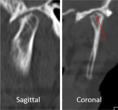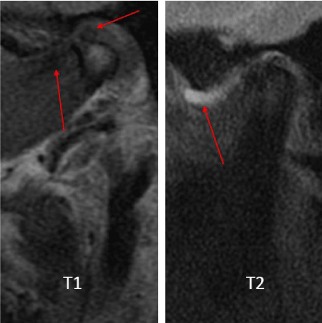 The mean age of CPPD-TMJ is 58 years old [19]. There is a female predilection (male-to-female ratio of 1:1.9) [20]. Patients often present with symptoms that include: intermittent acute arthritic attacks, joint effusion, preauricular swelling, and decreased joint mobility. It can present with otalgia and unilateral conductive hearing loss [21]. There are two presentations of CPPD-TMJ. The first type involves acute inflammatory attacks that cause painful preauricular swelling of the TMJ. The second is called tophaceous CPPD which can mimic a tumor (eg. synovial chondrosarcoma). The first published case of tophaceous CPPD-TMJ was described by Pritzker. et al. in 1976 as a pseudotumor [22]. The majority of cases reported have been the symptomatic tophaceous type. Of these, only ten presented with extra-articular extension and one extended to the skull-base; however, none showed intracranial invasion [23].