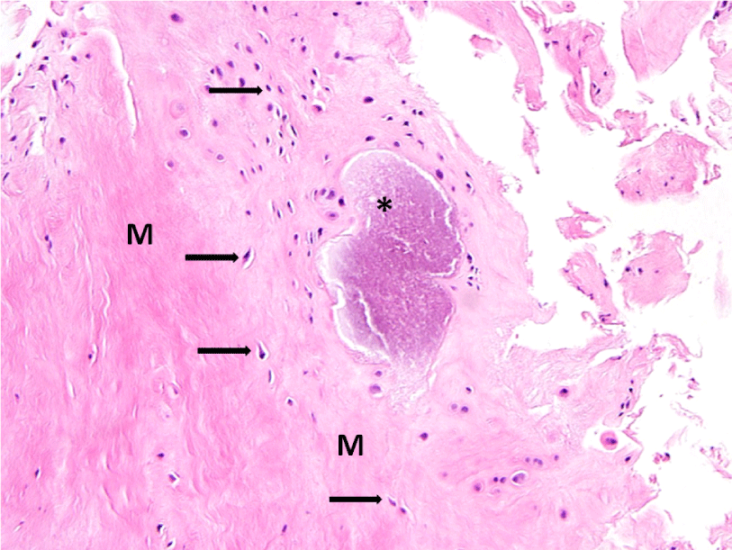 A 72-year-old female presented with left-sided jaw pain. Examination revealed tenderness over the left masseter, a mouth-opening of 35 mm and bilateral joint noises. Her left side had direct and indirect loading. The CT scan showed degenerative changes of the left condyle with a 2x2 mm subchondral cyst (Figure 10). The MRI revealed a degenerative left condyle with a deformed disc. The T2 weighted imaging showed a superior joint space effusion (Figure 11). Diagnostic arthroscopy showed retrodiscal synovitis, chondromalacia and a perforated disc. There were crystal-like structures within the synovium antero-medially. Synovial biopsy, debridement and partial synovectomy were performed (Figure 12). Histologic examination showed proliferative synovitis with calcium pyrophosphate deposition (Figure 13). The patient was referred for rheumatological management of CPPD but no treatment was initiated due to symptom resolution. On her 6-month follow-up her pain had resolved; she was maintaining a regular diet and her mouth-opening had become 45 mm with no joint loading.