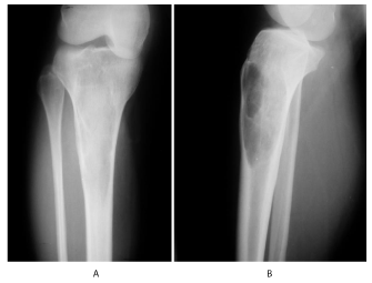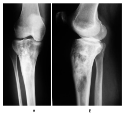 Hydatidosis consists mainly of either cystic or alveolar hydatid diseases, they are caused by echinococcus granulosus and echinococcus multilocularis, respectively. Echinococcus granulosus is a tapeworm cestode and is acquired through a cycle in which the humans are intermediate hosts. Most patients have hydatid cysts of their liver, spleen, and lungs, which are the major filtering organs of these parasites. It is rare for the hydatid cyst to escape these filtering mechanisms and be present primarily in the tibia. When present in the tibia, it is difficult to diagnose radiologically. Therefore, there should be a high level of suspicion in endemic areas, such as mediterranean region, Central Asia, East Africa, Australia and New Zealand [1]. Suspicion of a hydatid cyst may prevent recurrence and complications. We studied a 33 year - old patient with primary hydatidosis in the tibia, in whom recurrence after curettage led to treatment with a total knee arthroplasty.