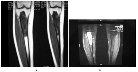 Figure 2: On the left: T1 coronal cuts showing hypointense proximal tibia lesion not reaching the articular surface, nor invading the surrounding soft tissues. On the right: T2 coronal cuts showing hyperintense lesion.