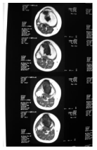 The bones are infected in 0.45% to 2.5% of all cases of hydatid cysts [2], 10 % of bony involvement is in the tibia, 35% in the spine, 21% in the pelvis, 16% in the femur, 6% in the ribs, 4% in the skull, 4% in the scapula, 2% in the humerus, and 2% in the fibula [3]. The cysts are present in metaphyseal and epiphyseal areas first. The cortex is a hard structure, and the cysts have a thinner envelope due to the absence of a pericyst in the bones. Both of these factors will orient the development of the cysts into the area of least resistance towards the diaphysis, lysing the trabeculae, and slowly eroding into the cortex. As a result, the cysts grow in an irregular, branching fashion in the bone. It may take 20 years before the symptoms appear [4], making bone involvement less common in the younger population. If soft tissue is reached, the cyst will grow more rapidly and uniformly to form a large, spherical cyst. The patient may present with leg pain along with a palpable tumor, a pathologic fracture, or an infection. X-rays will show a single or multiple osteolytic cystic images [5], it can be multilocular with reactive sclerosis forming a honeycombing pattern [6]. Periosteal thickening may appear on x-ray if there is a pathological fracture [7]. The differential diagnosis is benign bone cyst, giant cell tumor, brown tumor in hyperparathyroidism, fibrous dysplasia, chondromyxoid fibroma, tuberculosis, metastasis, and aneurysmal bone cyst. In front of such images further investigation is required. CT scan will better evaluate, as well as the MRI, the lesion and its possible soft tissue invasion. CT scan will not show a calcified cystic rim. The latter only surrounds soft tissue cysts, not cysts in the bone [8,9]. It is suggested that calcification varies according to the disease course and duration since calcification is caused by dystrophic changes of dead cysts [3]. MRI will show hypointense on T1 and hyperintense on T2 daughter cysts separated by various amounts of fluid collections. MRI may show on T2 a low signal intensity if nonviable scolices are present in the daughter cysts upon the pathology [10]. A water-lily sign has been suggested as a pathognomonic MRI sign, it is the image of detachment of the germinative layer of the cyst from the pericyst, but it is rarely observed [11, 1]. It has been suggested that x-ray and even CT scan of hydatid disease are similar to those of metastases, giant cell tumors, tuberculosis, and bone cysts. Only MRI may aid in the diagnosis of hydatid cyst [12,13].