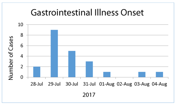 On Friday July 28, 2017, a business was having their corporate picnic at a rented party hall. There was 64 people in attendance, 28 reportedly became ill with gastrointestinal illness after the picnic. This indicated a possible foodborne outbreak associated with this corporate picnic. OCHD initiated an epidemiological investigation into this matter. An outbreak definition was developed and was defined as an attendee of the corporate picnic who ate food at the party hall on July 28 or contact who consumed leftovers and who became ill with gastrointestinal illness in the following 7 days.